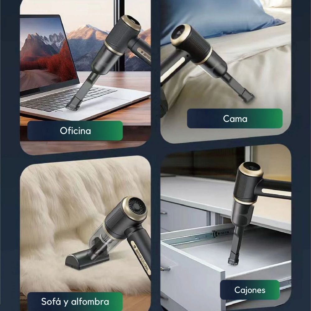 Limpieza sin límites: Aspira, sopla y elimina suciedad donde sea: hogar, oficina o auto. Potencia inalámbrica, 5 cabezales versátiles y filtro lavable para un aire más puro.❌ Olvídate de la suciedad difícil: llega a cada rincón con facilidad.