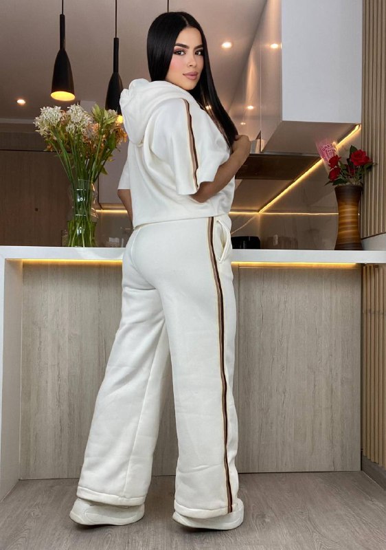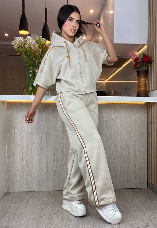 Incluye dos piezas: una chaqueta con cierre frontal y un pantalón tipo jogger, ambos confeccionados en algodón perchado de alta densidad.